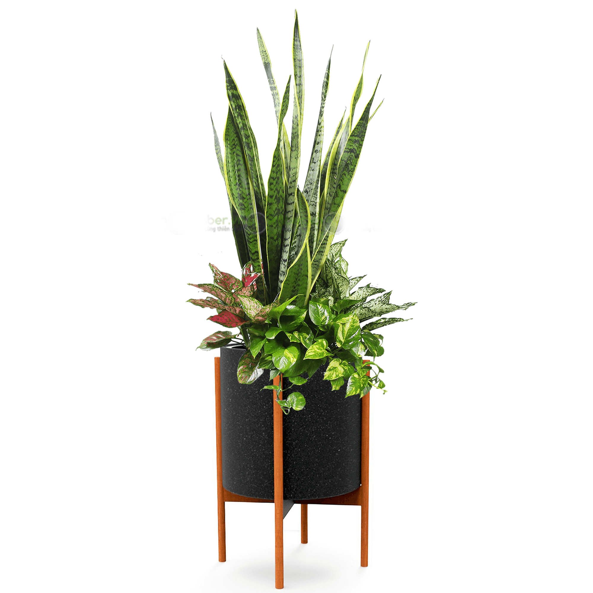 Mix Cây Lưỡi Hổ Ngọc Ngân Vạn Lộc Trầu Bà + Chậu composite kệ gỗ Anber – Anber Garden (Since 2015)
